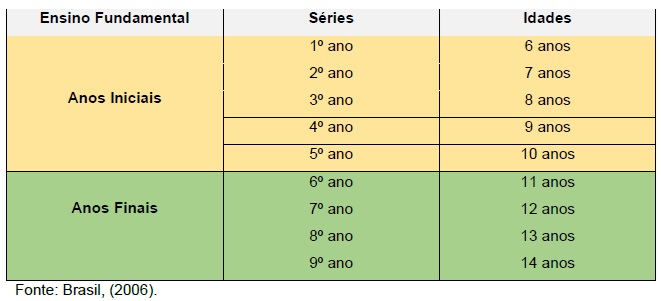 BRASIL. Lei nº 11.274, de 6 de fevereiro de 2006. Altera a redação dos art. 29, 30, 32 e 87 da Lei nº 9.394, de 20 de dezembro de 1996, que estabelece as diretrizes e bases da educação nacional, dispondo sobre a duração de 9 (nove) anos para o ensino fundamental, com matrícula obrigatória a partir dos 6 (seis) anos de idade. Diário Oficial da União, 7 fev. 2006. Seção 5, p.36.
